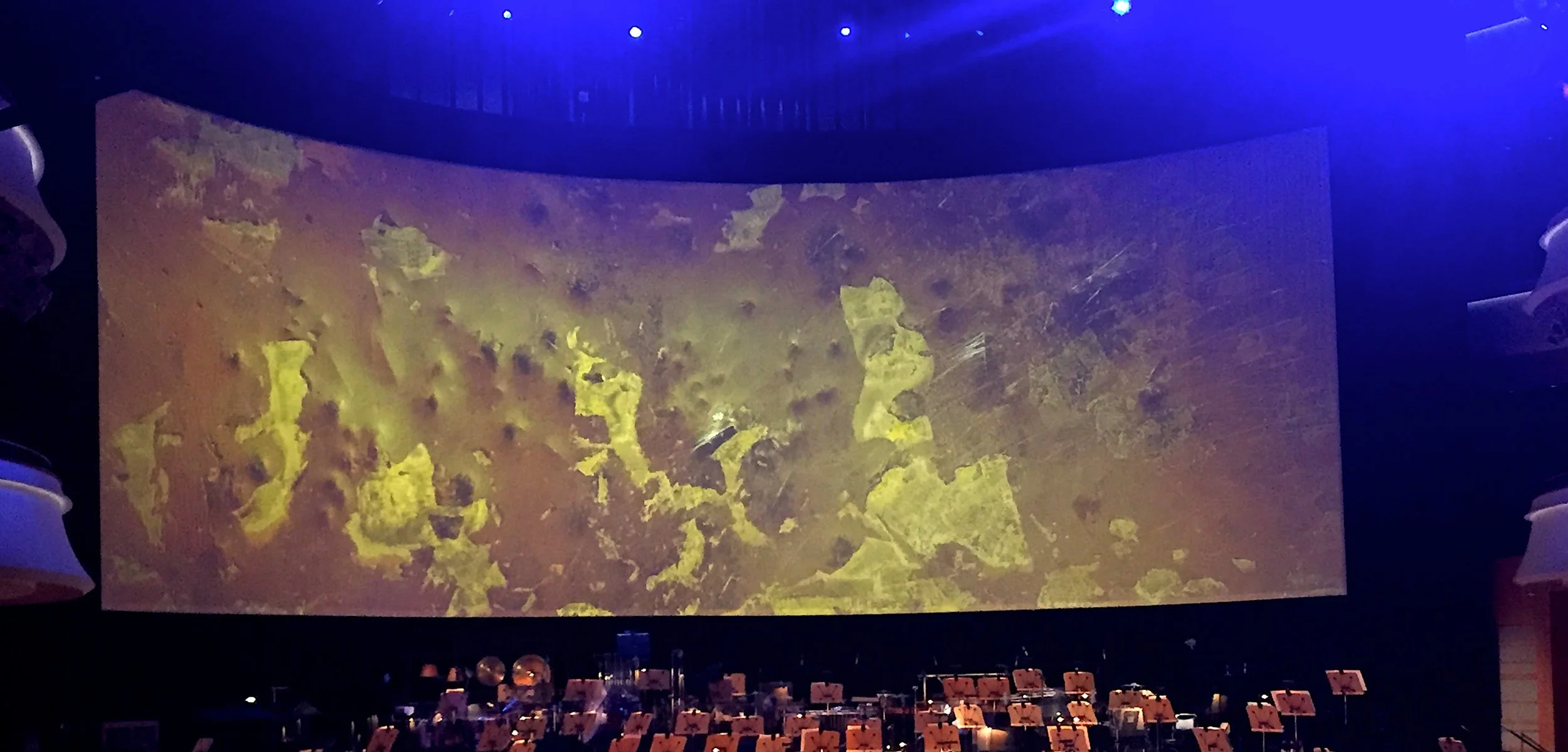 In 2018, our team was brought on to elevate the artistry of projected images for a broadcasted performance on ‘PBS Great Performances.’ The show alternates between orchestra-focused interludes and monologues of immigrant stories expressed by actors on stage. The canvas for our projection design was a 72’ curved screen fixed over the orchestra.